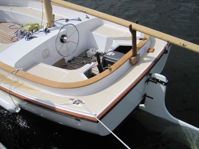The sails are in good condition and the motor well has an 8 hp Suzuki motor with destroyer wheel style steering.